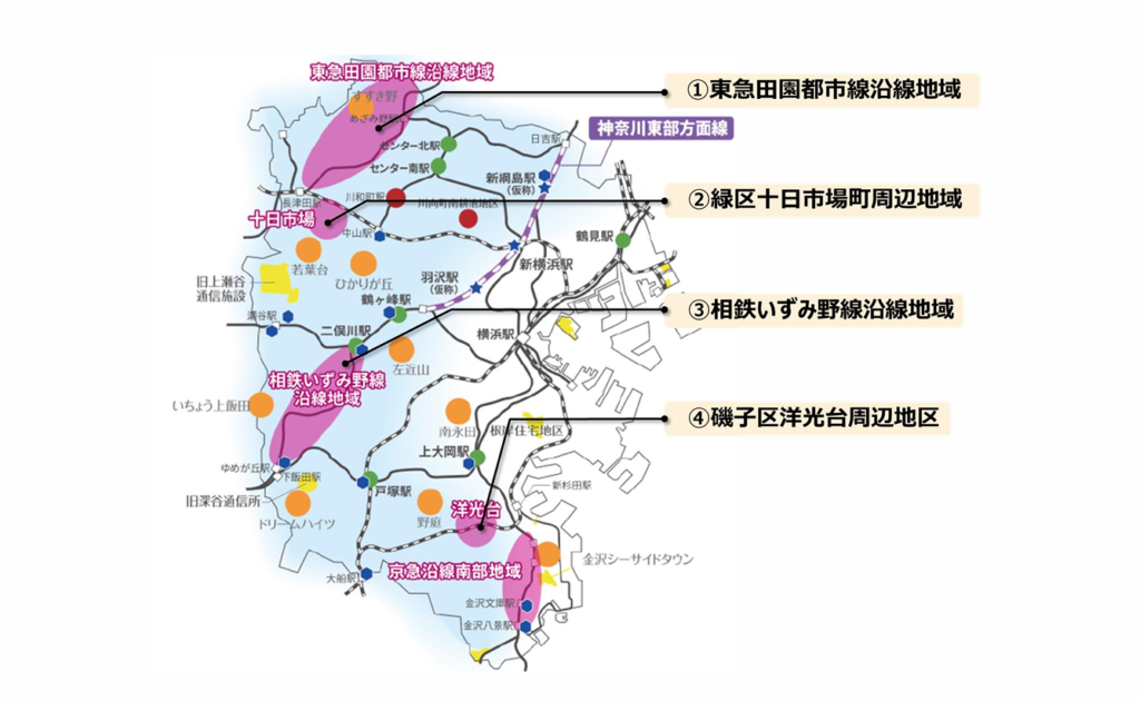 「SDGs 未来都市・横浜」の実現に向け、少子高齢化の進展、住宅の老朽化や空き家の増加など様々な課題解決を図りながら、持続可能な魅力あるまちづくりを推進するため、4つの地域で、地域住民や民間企業等と連携した取組を進めている。
